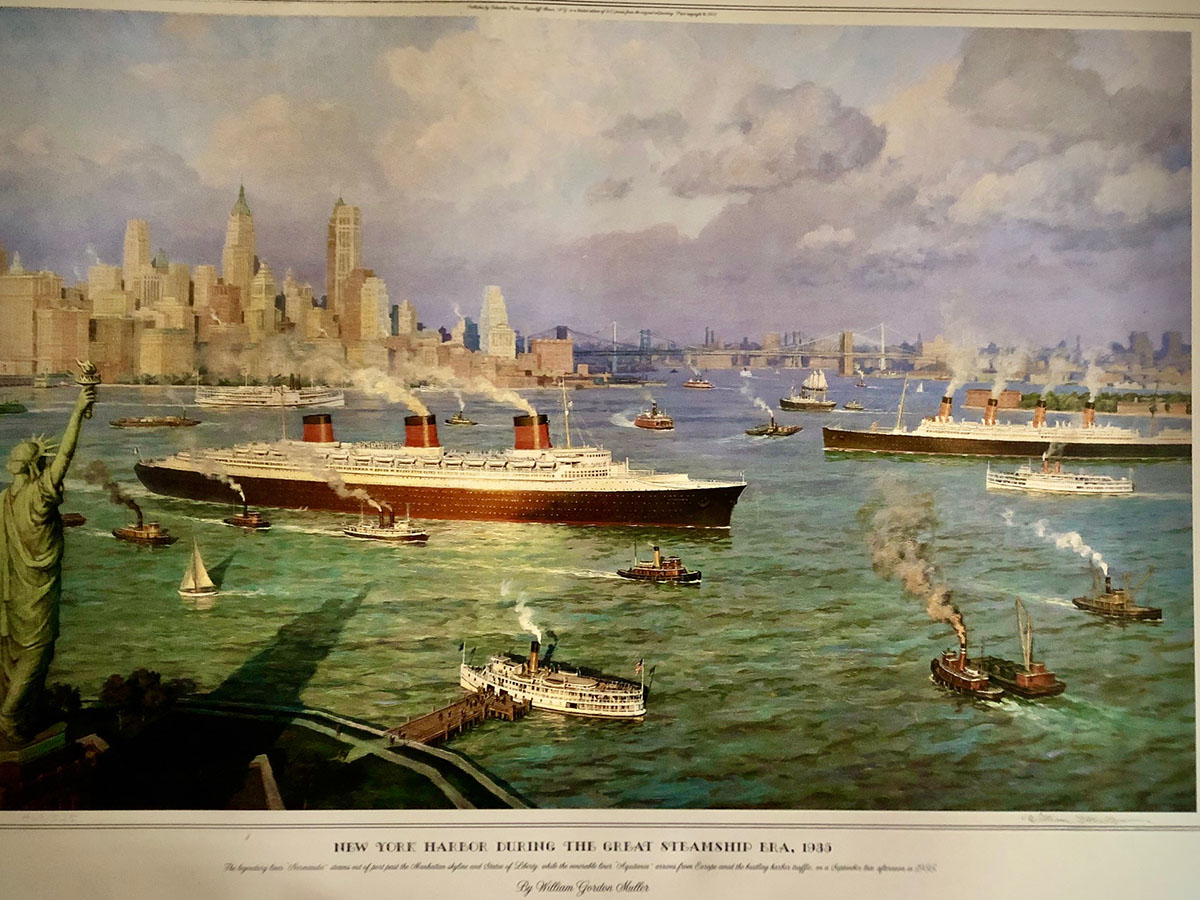 "Painting of teaming waters of New York Harbor; Yankee Ferry delivering the first dignitaries to the newly opened Statue of Liberty (front & center) The painter of this famous work is still with us on earth and is planning on coming to give a talk about her for the opening ceremonies of the Bow Gallery of Yankee’s history."